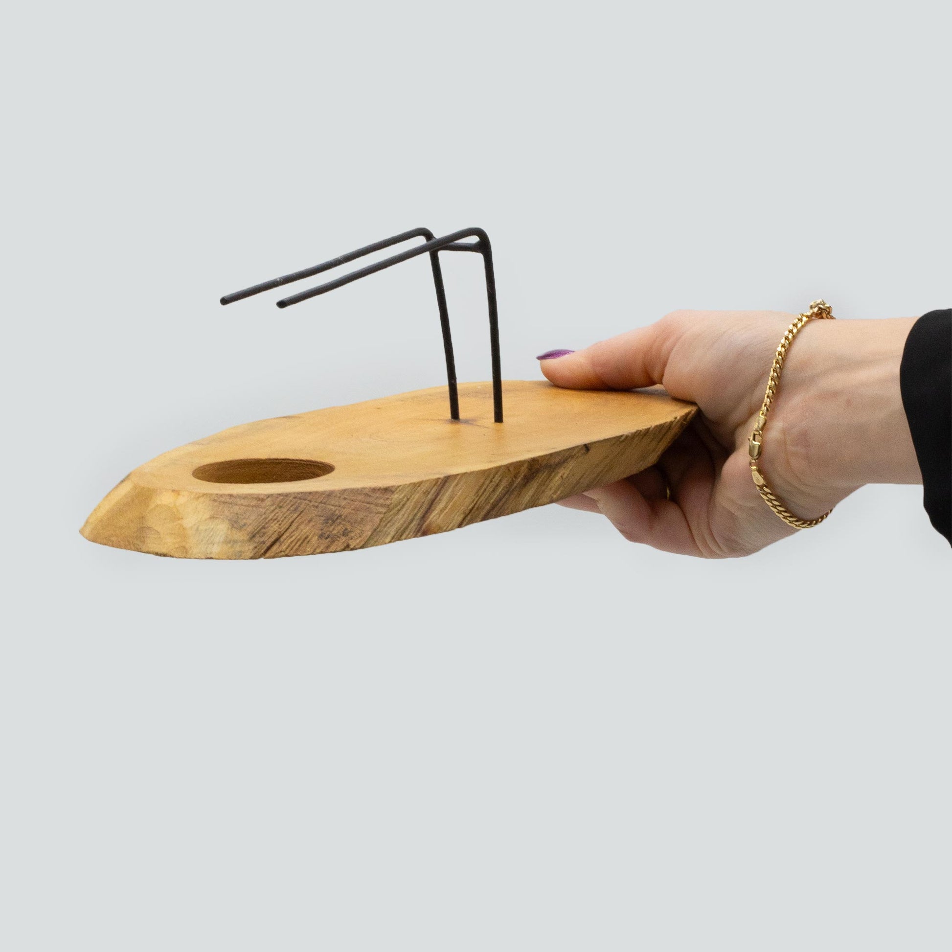 Handcrafted in Indonesia from Gamel wood, this minimalist holder uses a tealight to gently warm Palo Santo sticks placed on two metal prongs, releasing their natural aroma without direct burning. Available in natural, whitewash, or greenwash finishes.