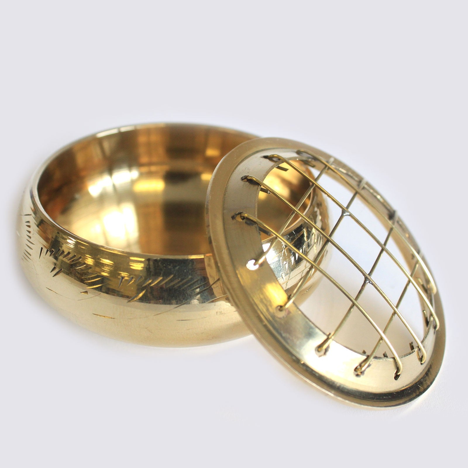 A compact and sturdy solid brass incense burner, designed for use with charcoal discs, resin, or cone incense. The jar includes a removable mesh screen for better airflow and cleaner burning. Its small size makes it ideal for home, studio, or ritual use.